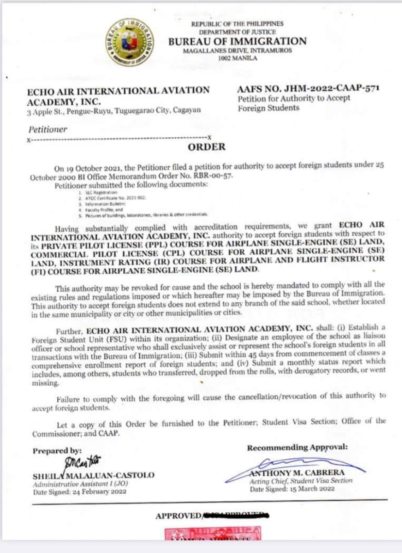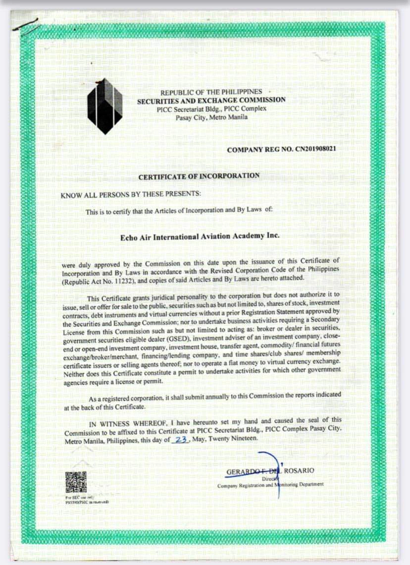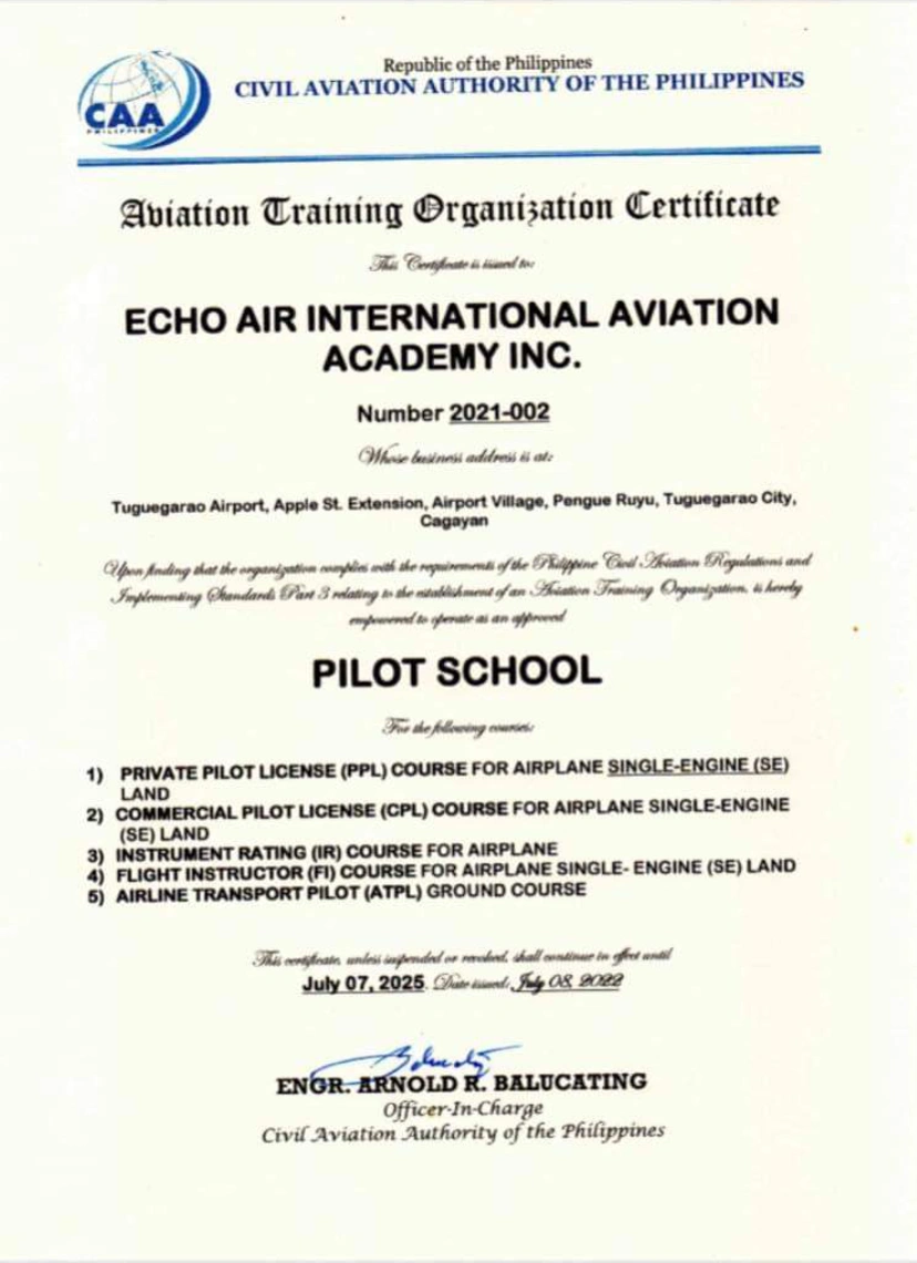 We the people of ECHO AIR INTERNATIONAL AVIATION ACADEMY INC believe in firm discipline which is the key to success in life, yet we prevail. In the air of openness through the love and affection of our Instructors that helps the students to develop their aviation qualities and to keep the school flag flying high above. We understand very well that students are the agent of future generation - the thinkers, planners, and leaders of the society and it is the duty of every flying school to feed them with proper aviation meal that enables them to be worthy world Pilots of tomorrow.